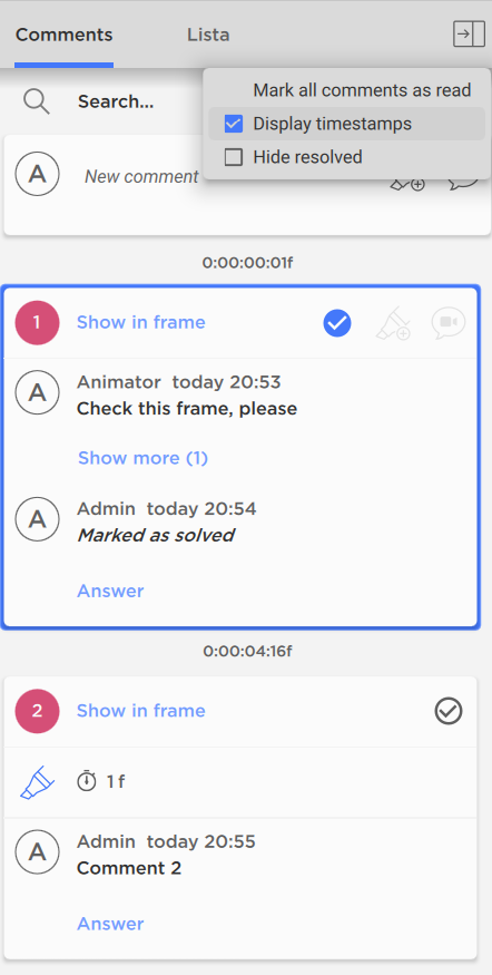 Unread comments have blue labels in the list. You can mark a comment as read or resolved. In the upper right corner, the gear icon hides commands for quickly marking all comments as read, displaying timestamps, and hiding resolved comments.