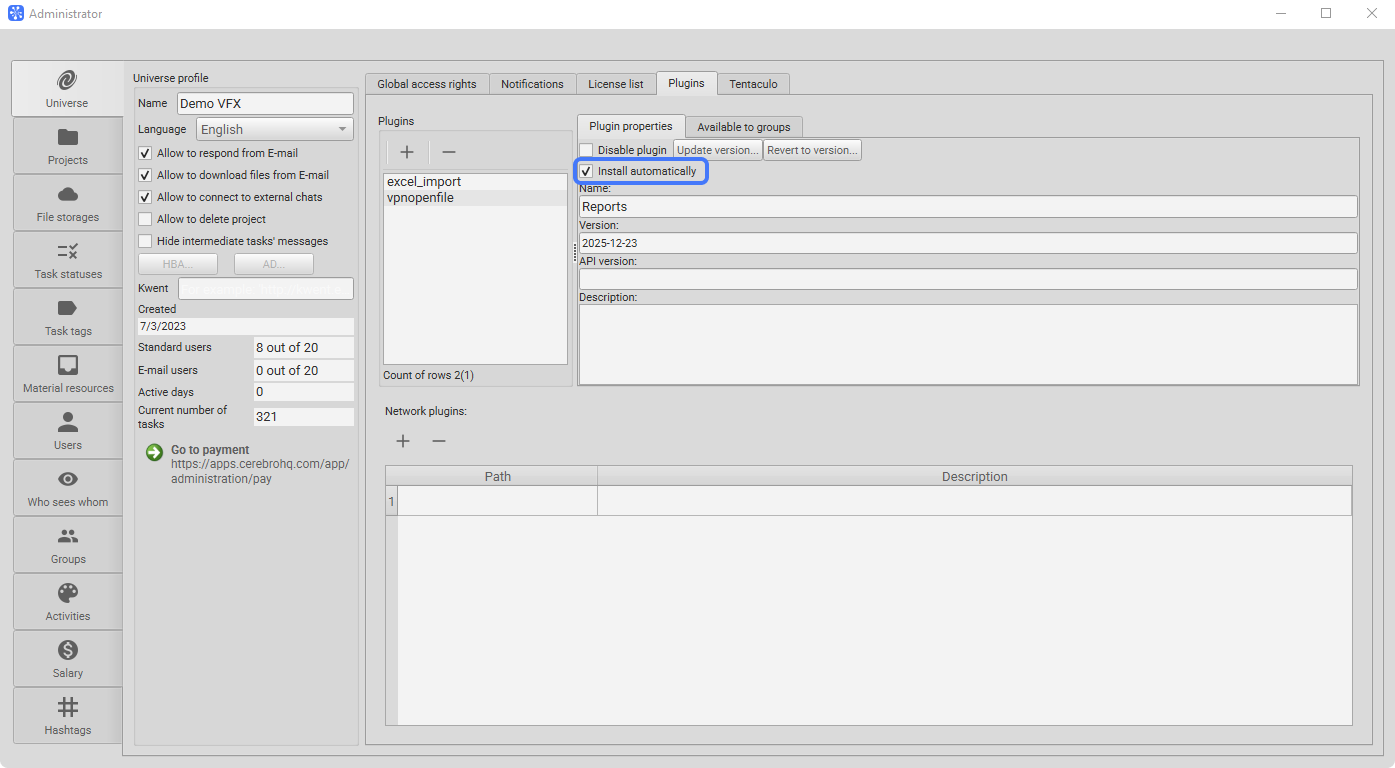 First, you can now enable automatic installation. If auto-installation is enabled for a plugin, it will be installed for users without additional prompts. If needed, the plugin can be disabled in the User Plugins window.