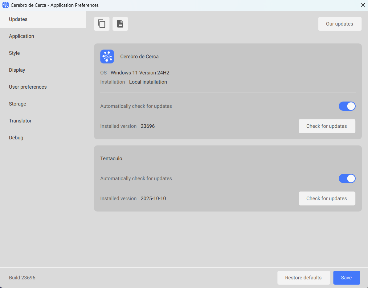 On the Updates tab, you'll find buttons that allow you to copy details about the application build and browse to the log file's location. In the top right corner, there's a button named Our Updates, which takes you to a page containing articles on past releases.
