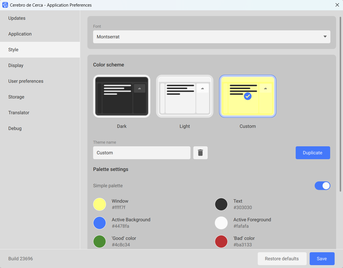 The standard version of Cerebro comes with 2 color schemes to select from. Additionally, you can create and adjust your own set of parameters. To create your own theme, choose one of the standard schemes and click Duplicate button. You will be prompted to enter the name of the new theme. In the settings, you can choose a simple palette (12 main interface elements) or a full palette (39 settings covering all interface elements).