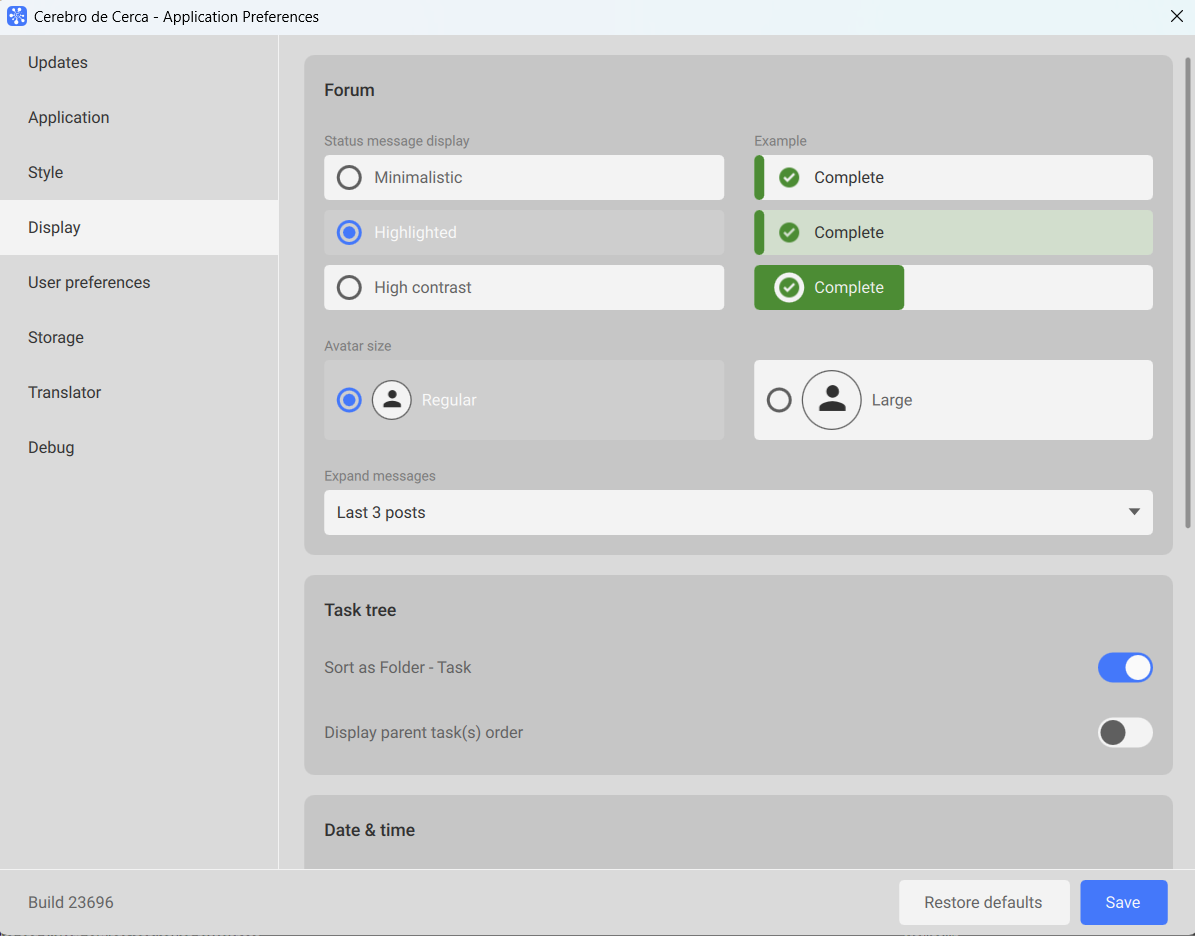 Here you can choose the notification format for status changes, adjust the size of user avatars in messages, and set the number of messages to expand in Forum.