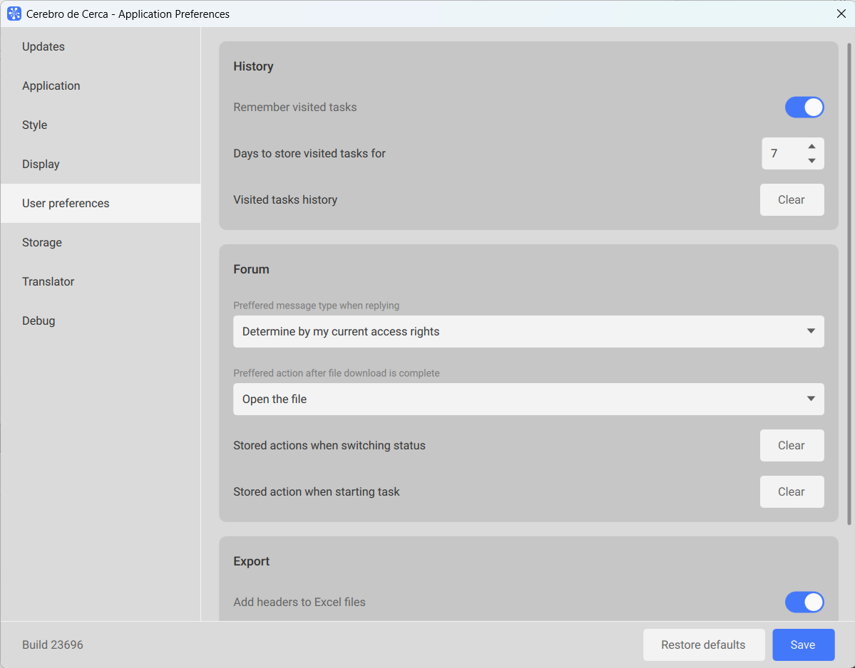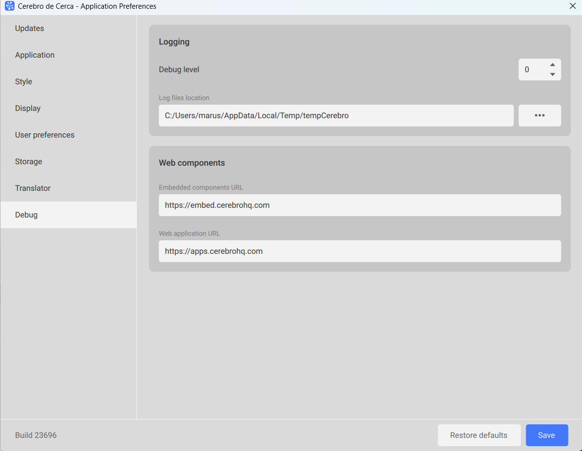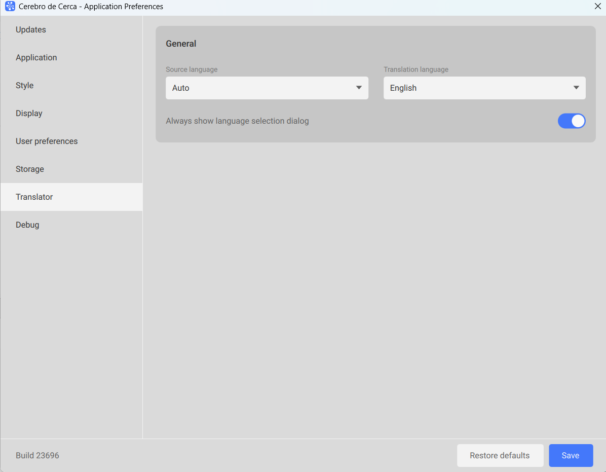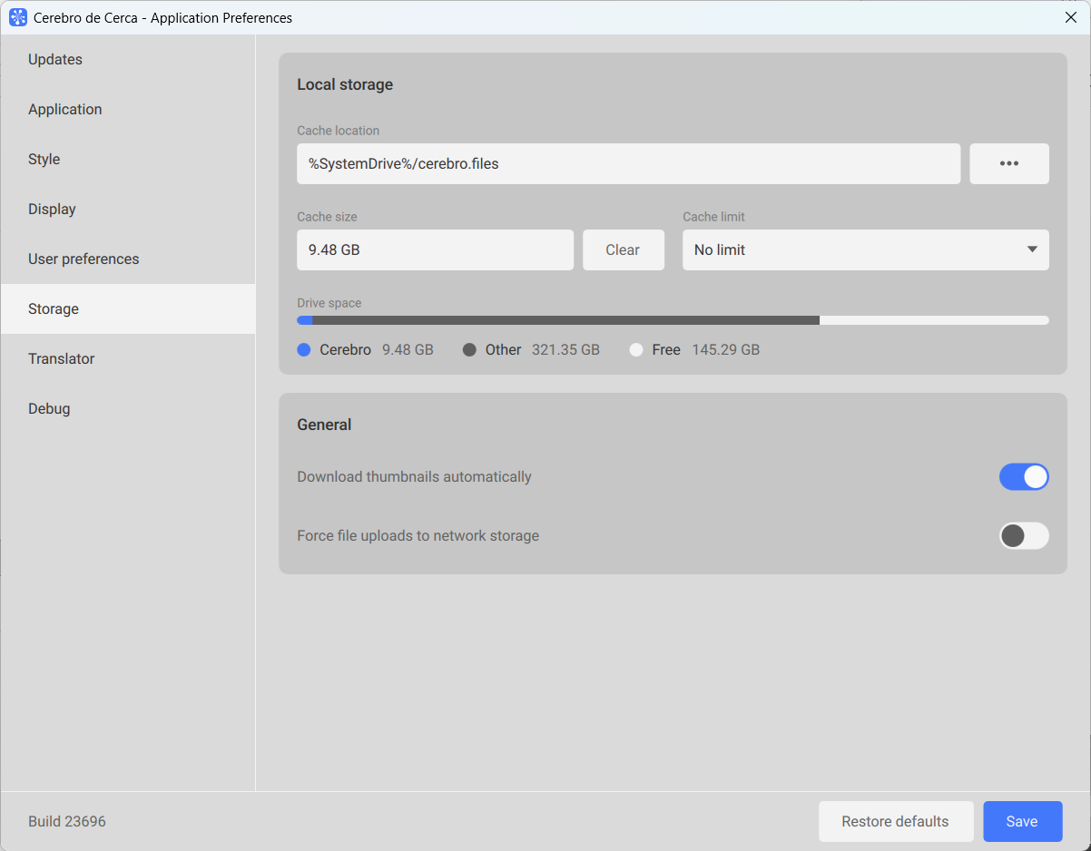 This settings window allows you to manage the cache for files downloaded to Cerebro. You can set a maximum storage limit, and if this limit is exceeded, the system will alert you and give you the option to clear the cache. You can also view and modify the folder where the cache is stored, if needed.