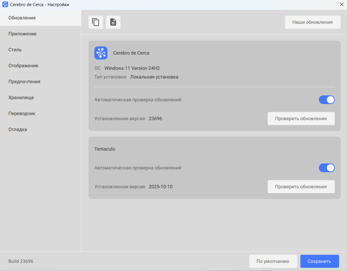 На вкладке Обновления доступны кнопки для копирования информации о сборке приложения и перехода к расположению лог-файла. В верхнем правом углу находится кнопка Наши обновления, которая перенаправляет на страницу со статьями о предыдущих релизах.