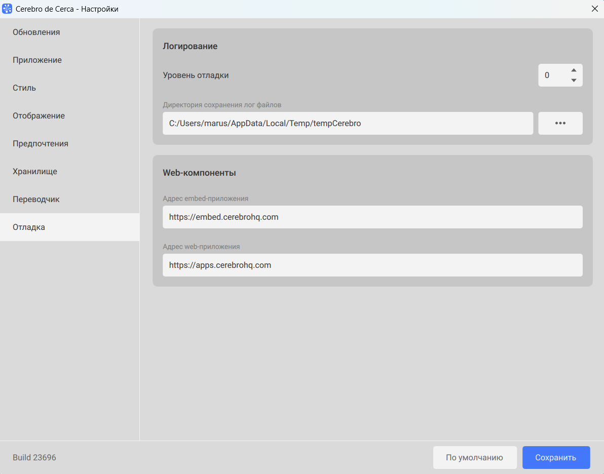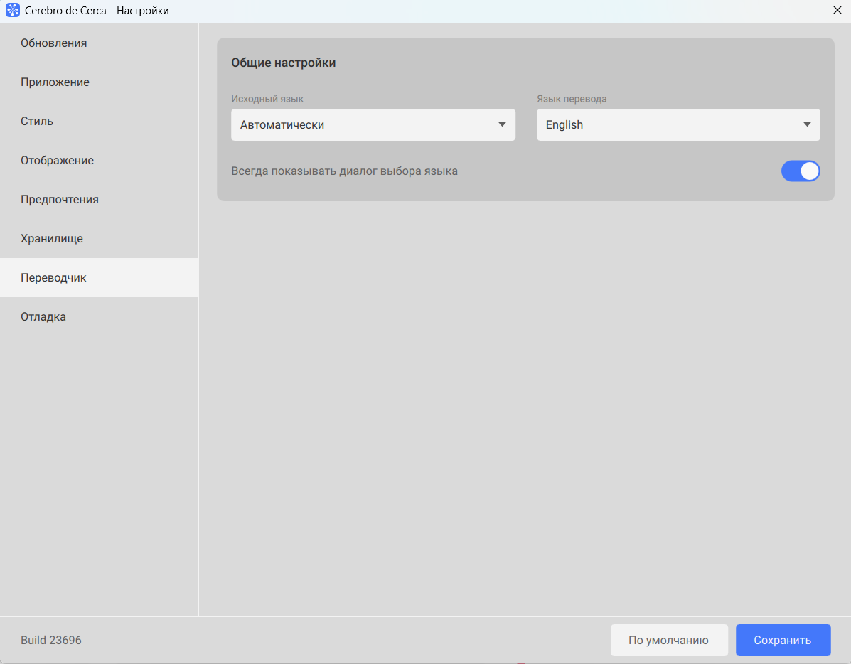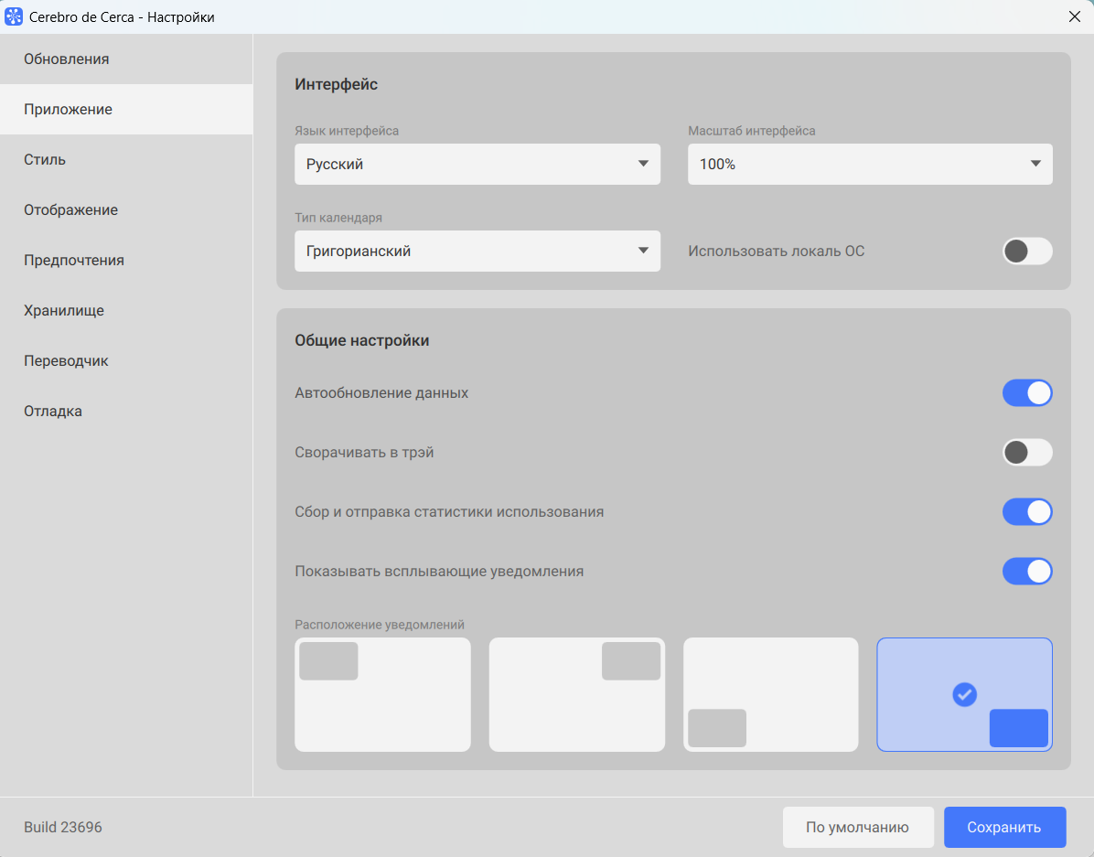 Система Cerebro обладает набором средств для гибкой настройки интерфейса программы под нужды конечного пользователя. Чтобы открыть окно настроек, выберите главное меню → Cerebro → Настройки.