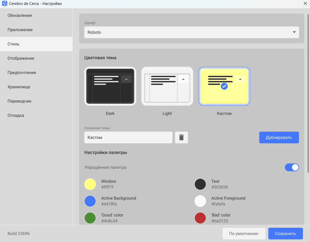 Стандартная версия Cerebro включает несколько цветовых схем на выбор. Кроме того, вы можете добавлять и изменять свои собственные наборы параметров. Чтобы создать свою тему, выберите одну из стандартных и кликните на кнопку Дублировать. Вам будет предложено ввести название новой темы. В настройках можно выбрать упрощенную (12 основных элементов интерфейса) или полную палитру (39 настроек, охватывающих все элементы интерфейса).