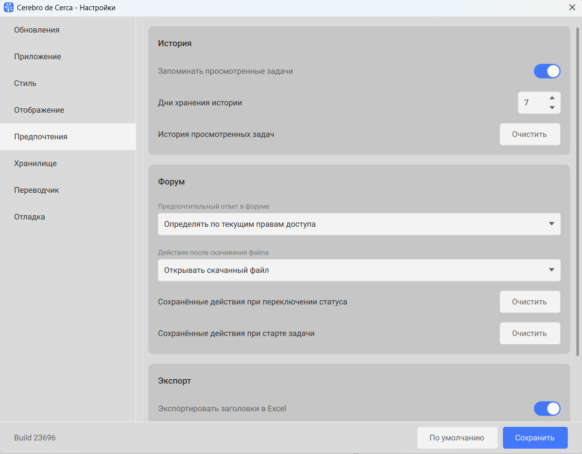 Вы можете активировать опцию запоминания просмотренных задач и установить срок хранения истории их просмотра. Если потребуется, можно быстро очистить историю с помощью соответствующей кнопки.