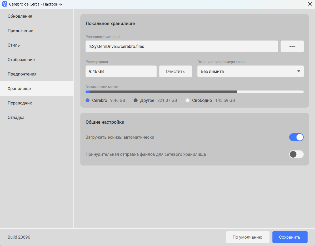 В этом окне настроек доступно Управление кешем файлов, скачиваемых в Церебро. Вы можете выставить лимит для хранения файлов, при превышении которого система пришлёт уведомление и предоставит возможность очистить кэш. Также можно посмотреть папку, в которой хранится кэш, и изменить ее.